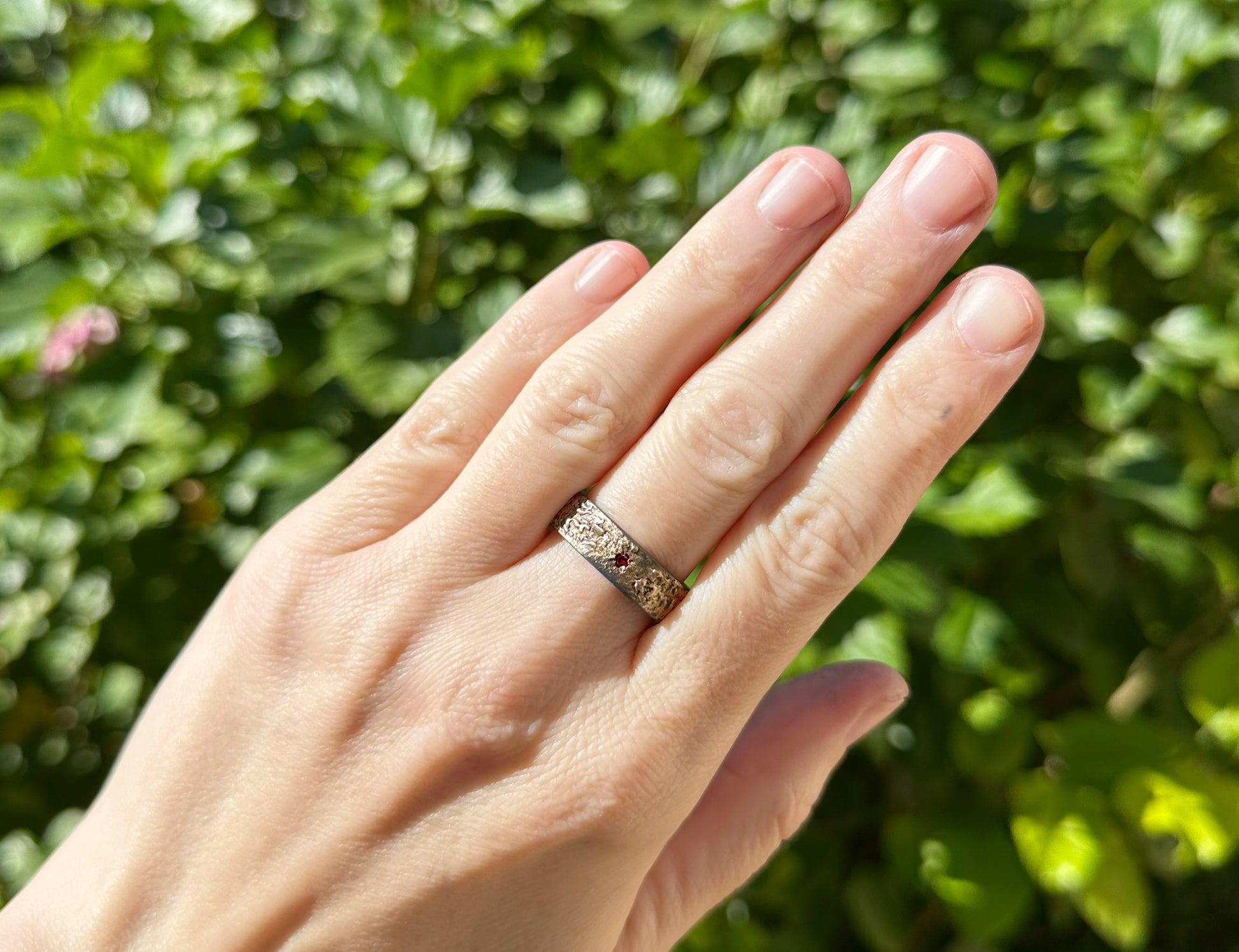 Einzigartiger Silberring mit einer durch Feuer entstandenen, reich strukturierten Oberfläche und einem lebhaften Kontrast aus Schwarz und Gold. Der schmalere Ring ist mit einem kleinen Edelstein Ihrer Wahl besetzt.