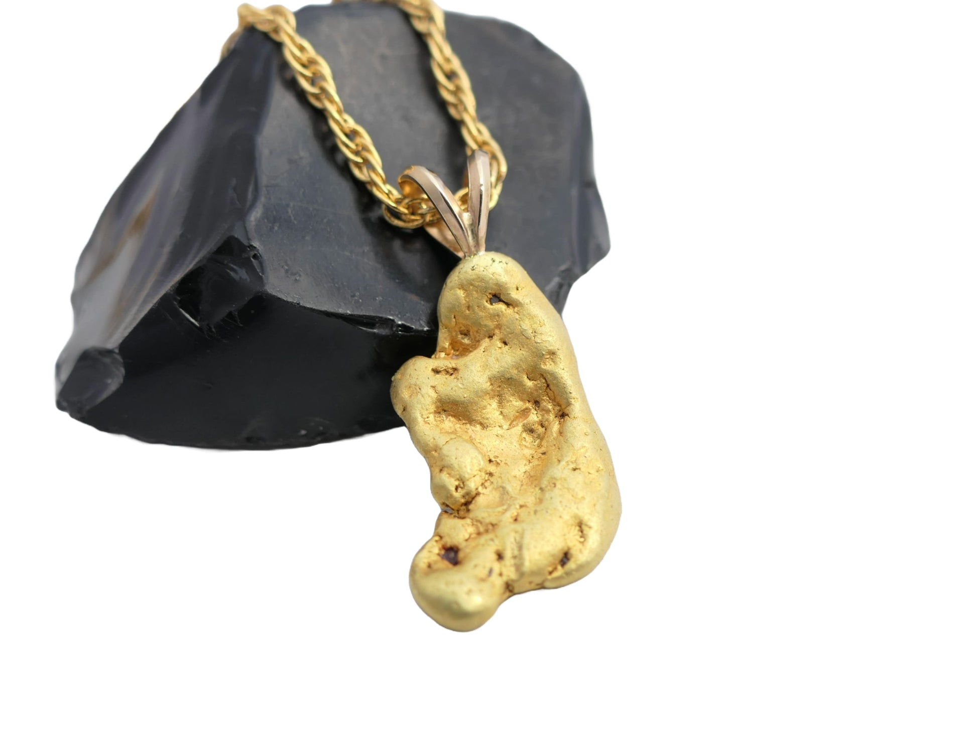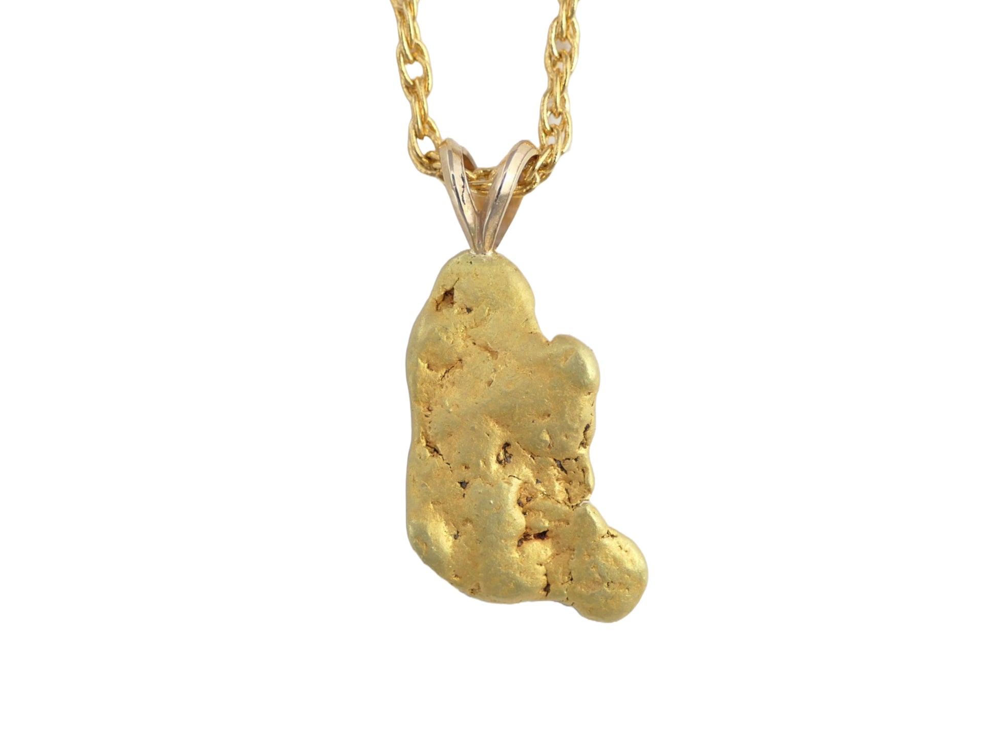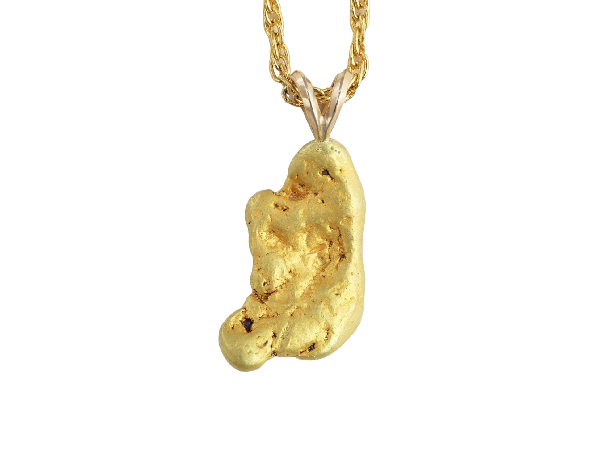 This pendant features a real, pure gold nugget. All natural, untreated and just as mined from the earth, with a beautiful raw surface and a saturated lush gold color. 23 x 14 mm. Purity in this location is about 22k.