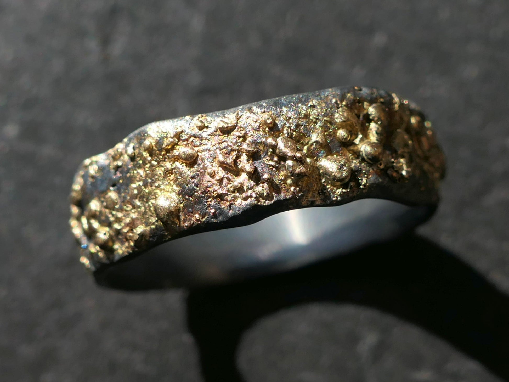 100% handmade gold and dark sterling silver ring with a molten structure, created by fire.